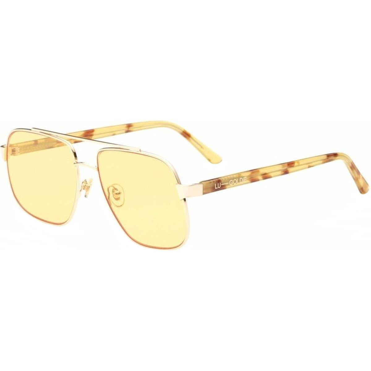 The Lu Goldie Amelia sunglasses in creme brulee showcase a retro aviator style exuding a vibe reminiscent of a confident highway patrol officer. Prepare for heads to turn, as your look is criminally stunning. Ideal for pairing with a '70s blouse and a fearless attitude. Perfect for road trips with open windows and music blasting, embracing the free-spirited essence of the open road.