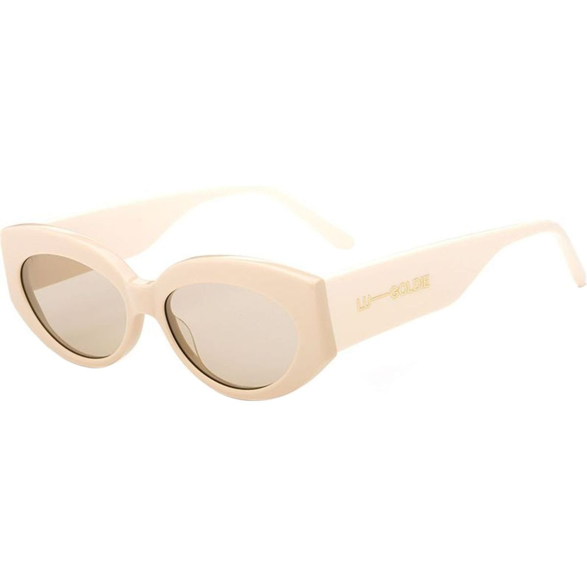 The Lu Goldie Aurelie sunglasses previously known s Aurora are a flattering design that will suit many face shapes. This Almond coloured frame features thick temples that showcase the Lu Goldie branding in gold lettering on each side and a soft cat-eye silhouette. The perfect accessory to dress up or down Lu Goldie always knows how to create styles that will suit all your outdoor sunny occasions.